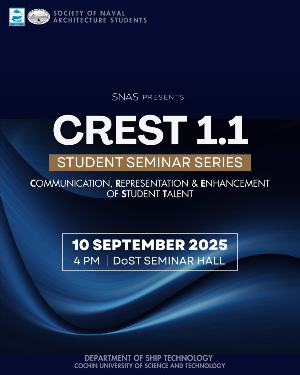 Founded in 1979, SNAS fosters academic excellence and cultural growth for naval architecture students at the Department of Ship Technology, CUSAT through seminars, workshops, and competitions.