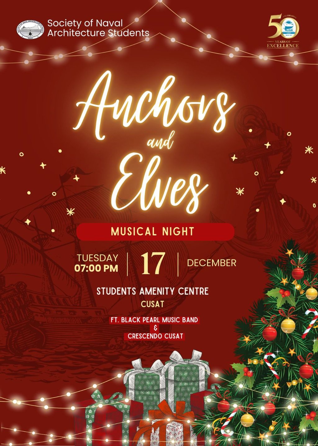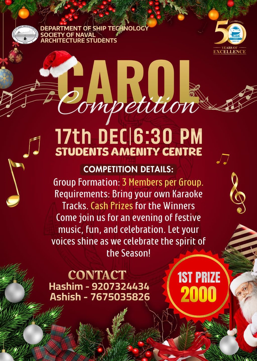 As part of the Golden Jubilee celebrations of the Department of Ship Technology, SNAS organized a vibrant Carol Competition that filled the campus with festive cheer. Teams from various batches participated enthusiastically, presenting beautifully harmonized carols, creative arrangements, and captivating performances. The event showcased the musical talents of students while spreading the joy and spirit of the season. Judges evaluated teams on melody, coordination, creativity, and presentation. The competition drew an energetic audience who joined in the festive ambience. Winners were honoured with certificates, making the Carol Competition a heartwarming and memorable highlight of the jubilee celebrations.