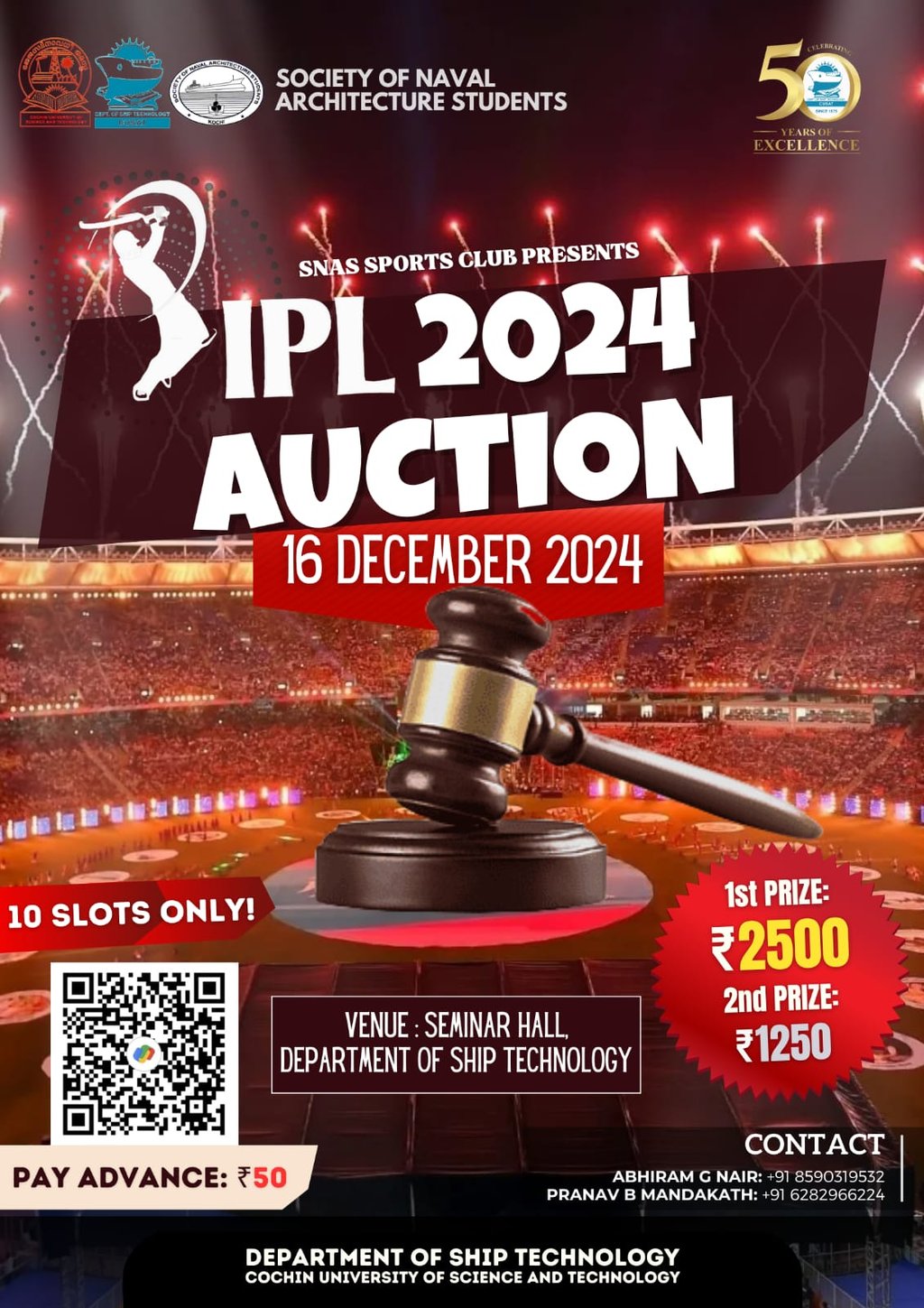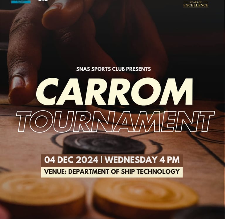 SNAS organized an exciting Carrom Tournament as part of the Golden Jubilee celebrations of the Department of Ship Technology. The event brought together students from all batches, creating a lively atmosphere of competition and camaraderie. Participants showcased impressive precision, strategy, and teamwork as they battled through intense rounds. The tournament attracted large crowds, cheering for their favourite players and adding to the festive spirit. Winners were awarded trophies and certificates, recognising their skill and sportsmanship. The Carrom Tournament not only promoted healthy recreation but also strengthened unity among students, making it a memorable highlight of the jubilee festivities.